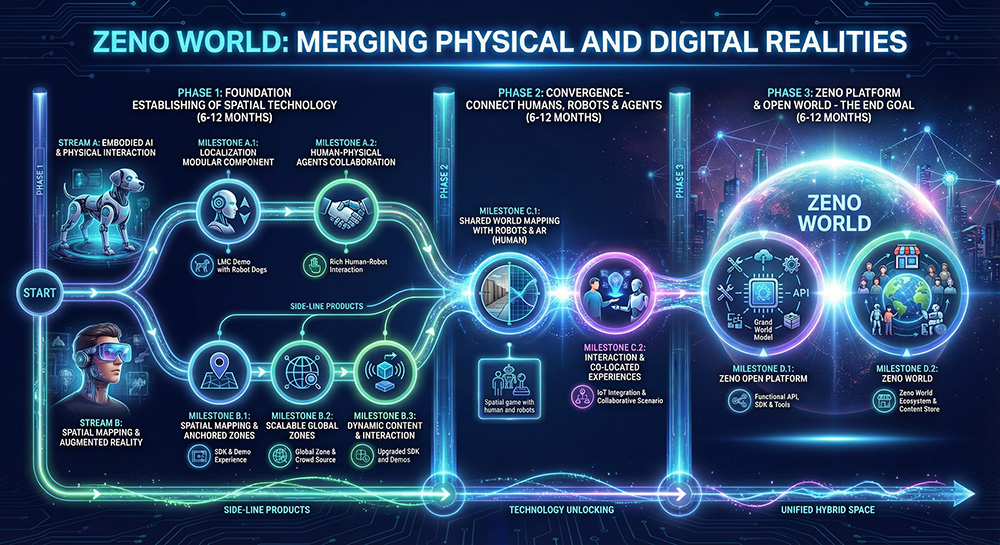 The phases and milestones represent technologies required to reach the end goal of Zeno World, and there will be some side-line products that will be built along with the journey as part of technology unlocking.
